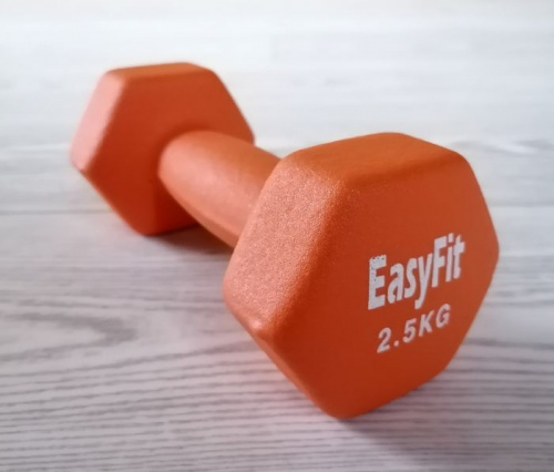 Гантели с неопреновым покрытием, обладающая хорошим сцеплением с ладонью. Особенность покрытия – поглощение материалом части влаги с ладоней. Гексагональная форма устраняет проблему перекатывания гантели по полу.